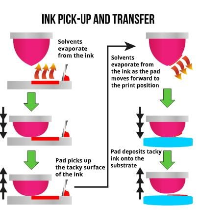 - Pad Transfer: The silicone pad is pressed onto the inked plate, picking up the ink.